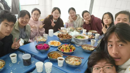 新乡学院实习带队老师刘红云(左二)和部分支教学生在和田希望小学共度肉孜节吃团圆饭