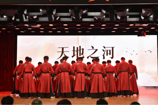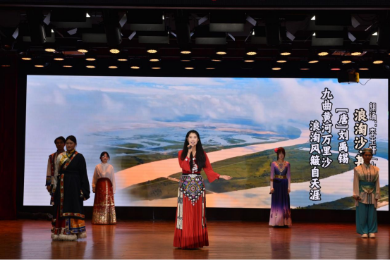 诗会以“黄”“红”“绿”三种颜色为基调,以诗歌朗诵、歌舞表演、情景再现等多元艺术形式,全方位展现黄河文化的深厚底蕴与时代价值。在雄壮激昂的“天地之河”舞蹈中,诗会拉开了序幕。第一篇章“黄河之魂——大河诗韵”的色调为黄色,代表中华优秀传统文化,来自黄河流域九省的师生代表朗诵了《诗经》《使至塞上》等古典诗词。第二篇章“黄河之光——民族脊梁”色调为红色,代表革命文化,姚喜双充满深情地朗诵了《沁园春·长沙》,教师代表用豫剧戏歌的形式创新演唱《沁园春·雪》,彰显了胸怀天下、志存高远的革命抱负,以及以天下为己任、改造旧世界的担当精神。第三篇章“黄河之兴——时代强音”的色调为绿色,代表社会主义先进文化,于同云、李莎倾情演绎了《念奴娇·追思焦裕禄》《郑州黄河湿地》,反映了执政为民的宗旨意识和在实践中践行习近平生态文明思想,体现了新时代的治国理政理念;教师代表用情景诵读的形式创新朗诵了台湾诗人余光中的《黄河》,彰显了深沉厚重的家国情怀与民族文化认同,反映了漂泊游子对民族根脉的眷恋与追寻。随着首届校友、著名女高音歌唱家赵云卿与在校大学生联袂合唱《珊瑚颂》,诗会的氛围被推向了高潮。